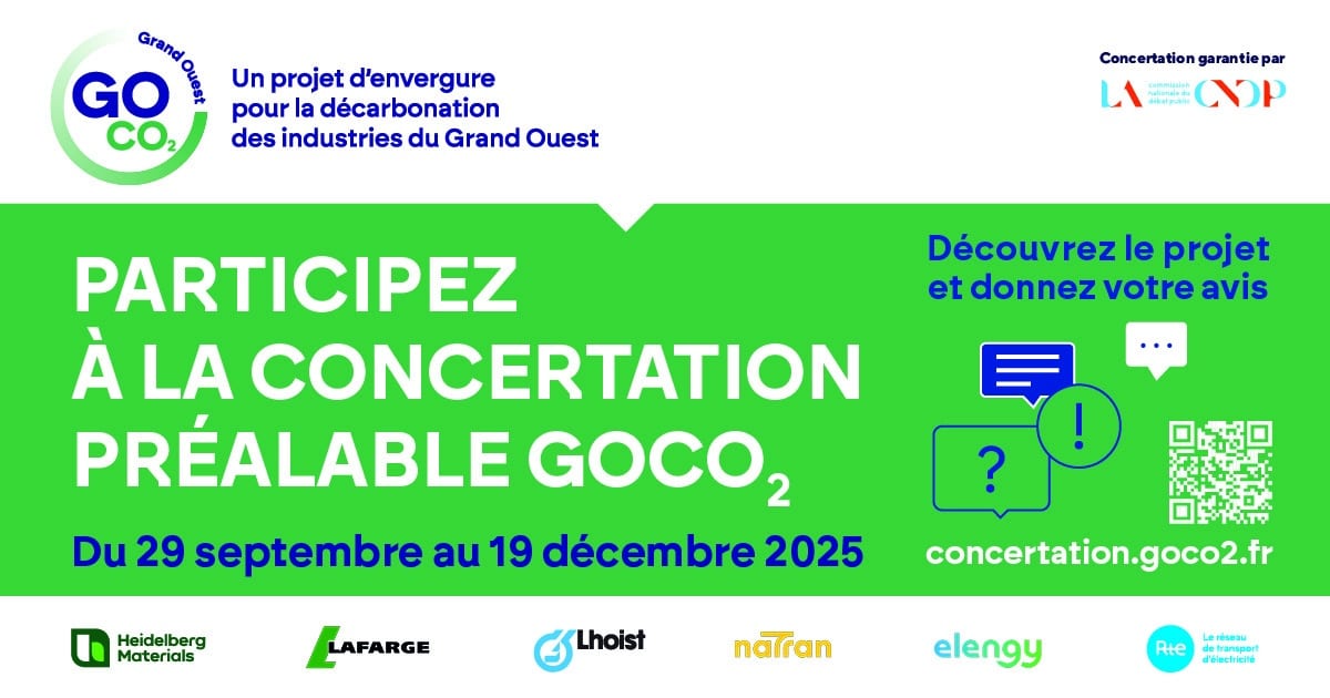 Afin d’informer et d’obtenir l’avis du public sur le projet GOCO2, une concertation préalable est organisée du 29 septembre 2025 au 19 décembre 2025 sous l’égide de la Commission nationale du débat public.