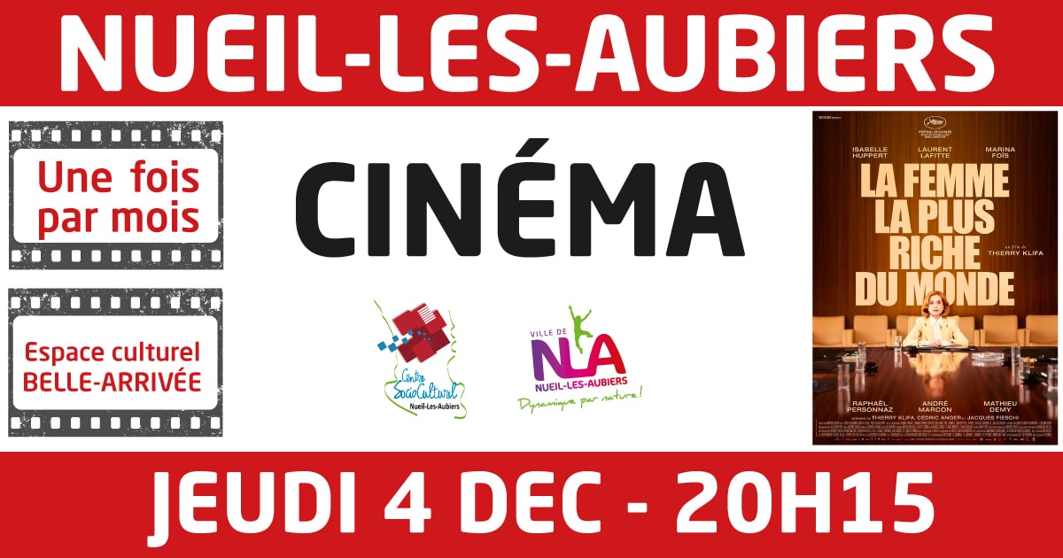 espace culturel Belle-Arrivée 46 avenue Saint-Hubert, Nueil-Les-Aubiers, FranceUne fois par mois, la ville fait venir le cinéma à Nueil-Les-Aubiers, en partenariat avec le Centre Socio-Culturel et le Centre Régional de la Promotion du Cinéma ! Au programme le JEUDI 4 DECEMBRE : LA FEMME LA PLUS RICHE DU MONDE 29 octobre 2025 en salle | 2h 03min | Comédie dramatique De Thierry […]
